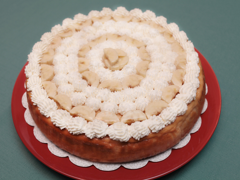 Creamy banana cheesecake over a butter cookie crust, topped with freshly whipped cream and covered with banana slices.
