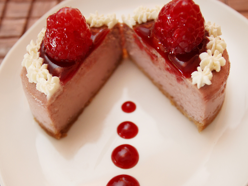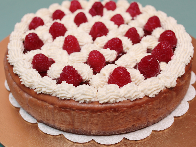 Creamy raspberry cheesecake over a butter cookie crust, topped with fresh raspberries, sauce and freshly whipped cream.